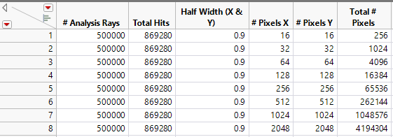 In my case, I was using a source ray file provided by a supplier modeled at 5e5 analysis rays. Setting up my detector at the exit of my mixing tunnel, Zemax tells me that my Total Hits = 869280. I created a JMP data table with different number of X & Y pixels, shown below