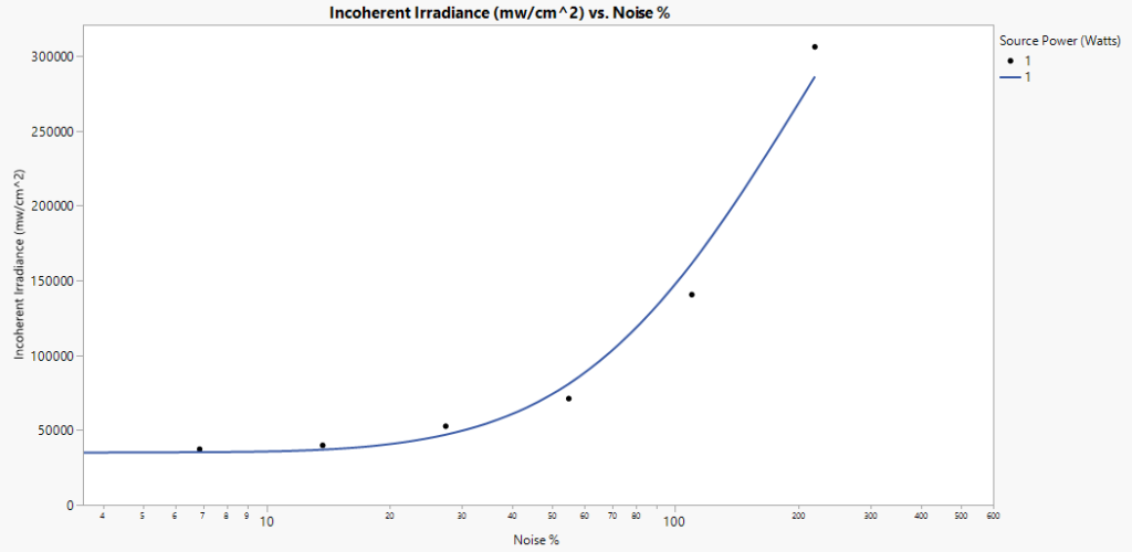 In the second graph, we can really tease out some interesting information. We see that we want to converge on a proper and accurate irradiance value, and that convergence is based on the noise %.