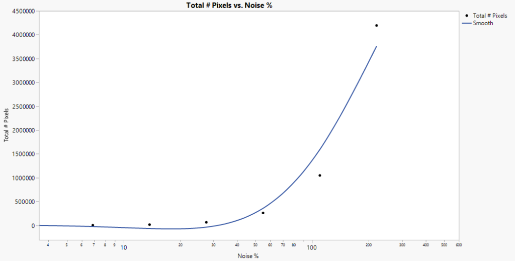 We now have some interesting information to plot. In the first graph, we can see how our noise % increases with total number of pixels, because we have not increased our total number of analysis rays. To me this was not inherently intuitive, as I thought increasing the number of pixels would give me increased spatial resolution. But it turns out that increasing the number of pixels is only part of the solution.